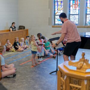Each morning began with an opening in the sanctuary, which included the Matins liturgy, a hymn that fit the theme of each day, the Bible passage for each day’s Bible lesson, and a short message from Pastor Walworth. After Matins, the children shifted to choir rehearsal, where they learned the Bible memory verse with sign language, as well as an anthem with Latin/English text.