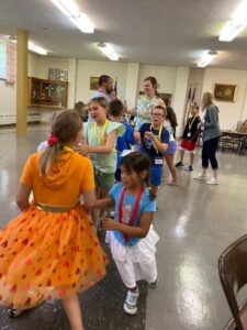 In the late morning, the activity incorporated classical music with movements to the flow of the music. After lunch, the children had a second musical movement opportunity in the form of folk dancing. Then they again split into three groups for the afternoon rotations of science, games, and handbells.