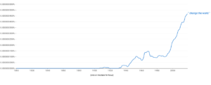 Our age has a burning ambition to “change the world.” In his book Culture Making, Andy Crouch (writing in 2009) noted that 216 books in the Library of Congress had that specific phrase in their title. (Scintillating reads like Mauve: The Color that Changed the World.) What’s even more interesting, though, is that a full third of those books had been published since 2000.