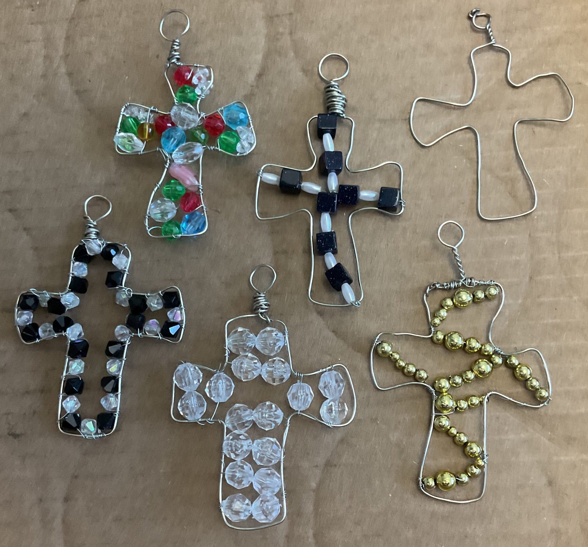 Wire Wrapping – This has only 30 spots available. We will learn how to wrap small beads inside a wire cross shape to make either a small sun catcher or a pendant. This is a technique that wraps very fine wire and beads around a wire shape. No previous craft experience is required. Necessary tools are provided, but if you have your own jewelry-making tools you are free to bring them.