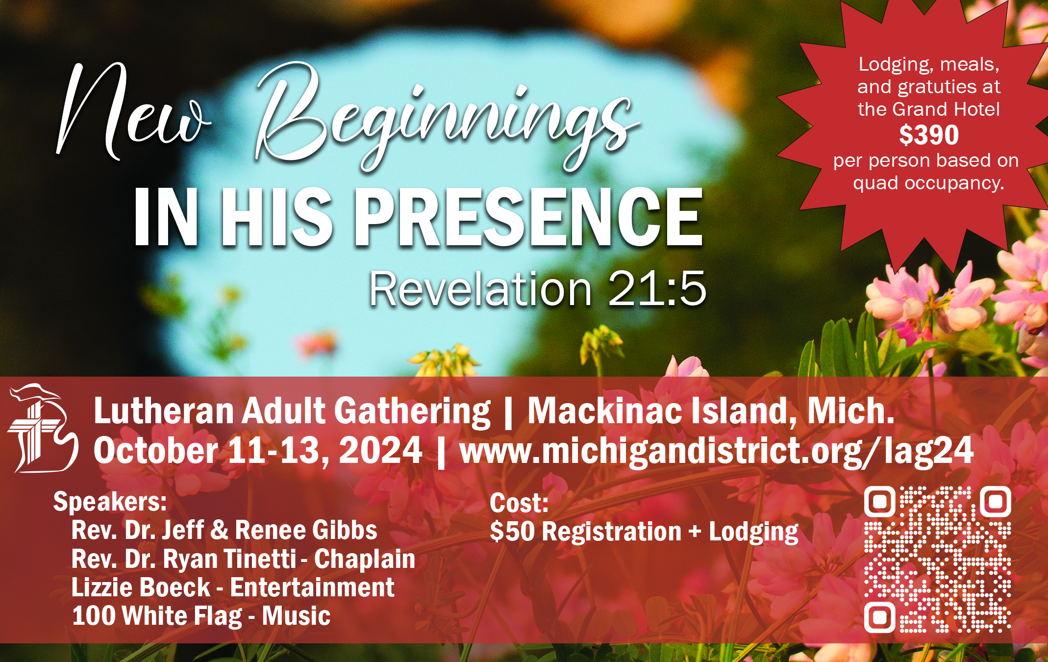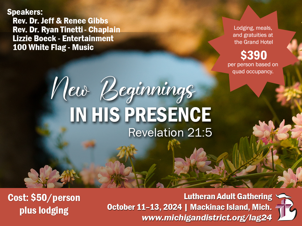 You are invited to the Lutheran Adult Gathering at the beautiful Grand Hotel on Mackinac Island, October 11–13, 2024. Since 1981, the Lutheran Adult Gathering has brought together believers to this spectacular setting to be spiritually strengthened for service to Christ in this world. The theme for the 2024 Gathering is “New Beginnings IN HIS PRESENCE,” based on Revelation 21:5. Nationally renowned speakers will inspire and encourage us to connect with the next generation of believers with the hope-filled and unchanging message of the Gospel.