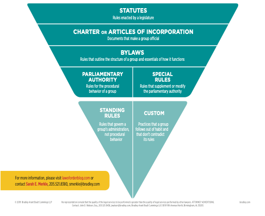 To understand the answer to the question, it is helpful to visualize the hierarchy of organizational authority. While we understand absolute authority belongs to God and His Word, for the purposes of this article we will address these subjects in the eyes of the State. The Law of Order Blog (lawoforderblog.com) provides the graphic above to assist in the visualization of the hierarchy of organizational authority. Notice that state and federal laws (Statutes) have the ultimate authority in the establishment of operational boundaries for organizational meetings. The second level of authority is the congregation’s Articles of Incorporation. Because the congregation has organized as a corporation in the State of Michigan, it has voluntary subjected itself to certain statutes, including the Nonprofit Corporation Act. Third on the list is the organization’s bylaws. It is common practice in the Lutheran Church—Missouri Synod to actually divide the authority in this level into two documents—Constitution and Bylaws—with the Constitution having authority greater than the Bylaws. Fourth on the list are the Parliamentary authority (Robert’s Rules) and the Special Rules adopted by the organization’s voting assembly.