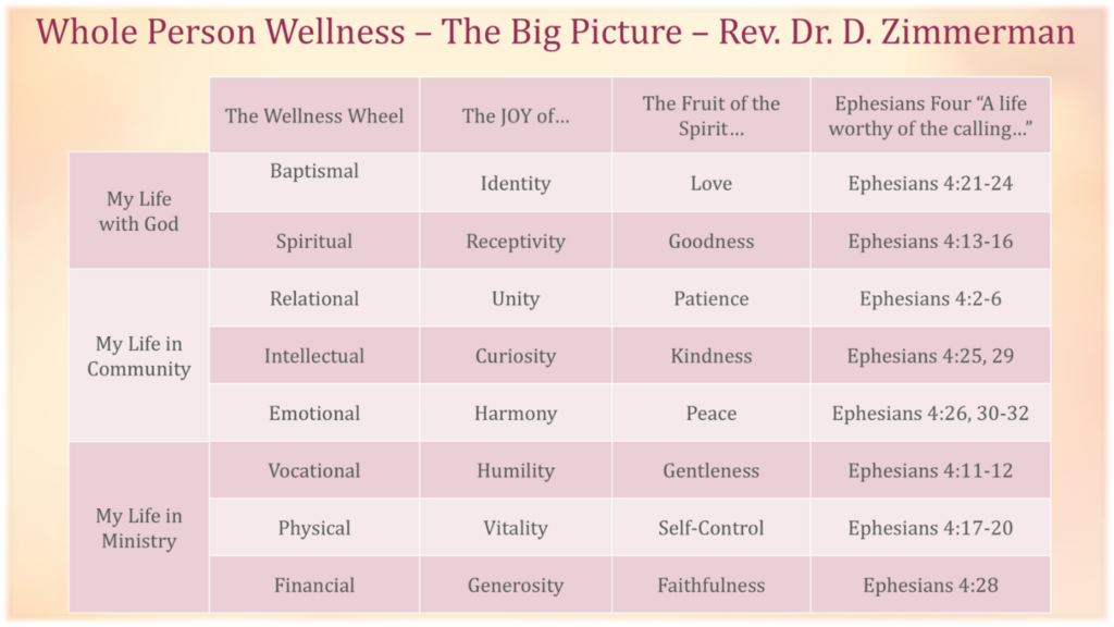 As we work our way through 2026, we invite Michigan District church workers to reflect on their calling through the lens of the Wholeness Wheel. Rooted in the truth that we are fully redeemed in Christ—body, mind, and spirit—this series will encourage intentional care across various aspects of life and ministry. Rather than striving for balance in and of itself, the Wholeness Wheel helps us recognize where God is sustaining us and where He may be calling us to renewal.