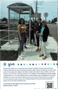 * The LCMS committed to providing one million dollars to its congregations in matching funds for projects that support the needs of families during the beginning-of-life stage of their children. The program is administered by LCMS Life Ministry. For more information, visit lcms.org. $4,350 was given to the bus stop project, with the other $4,350 being raised by Our Savior, Grand Rapids with the help of LFLMI.