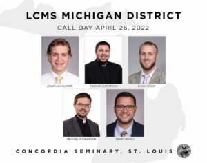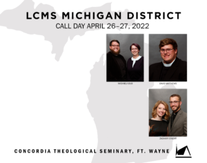 On Tuesday, April 26, Concordia Seminary in St. Louis, Mo. (CSL) held two separate worship services for assignment of vicarage and internships and for call placements, respectively. Vicars assigned to the Michigan District are Jonathan Dueker (Messiah, Clio), Noah Menke (Journey, Oxford), and Adam Tanney (St. Lorenz, Frankenmuth). Candidates receiving their first placement in Michigan from CSL are Thomas Gustafson (Immanuel, Grand Rapids) and Michael Stainbrook (St. Luke, Haslett).