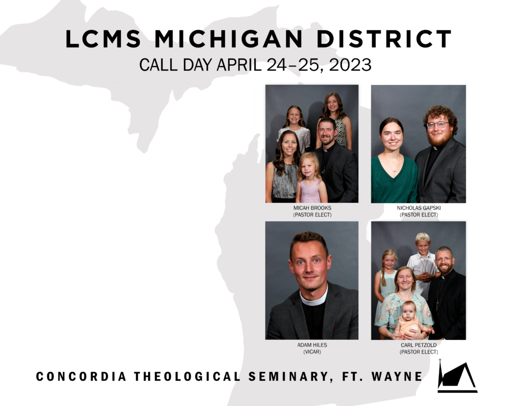 On Monday, April 24 and Tuesday, April 25, two separate worship services took place at Concordia Theological Seminary, Fort Wayne, Ind. (CTSFW) for assignment of vicarage and internships and for call placements, respectively. Adam Hiles was assigned as a vicar to Historic Trinity, Detroit, and the following pastoral candidates received their first placement in the Michigan District: Nicholas Gapski (Family of God and Saint Stephen, Detroit); Micah Brooks (St. Luke, Nunica); and Carl Petzold (Hope, St. Helen and St. John, West Branch).