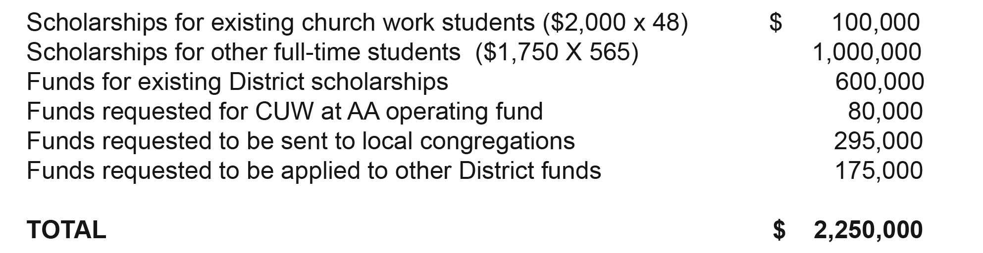We have been in touch with financial officers at Concordia Wisconsin who have worked with us to identify the number of full-time students (48 church work and 565 other) at CUAA and given us a path to provide financial assistance to them. Our intention is to provide $2,000 to all full-time church work students and $1,750 to all other full-time students.